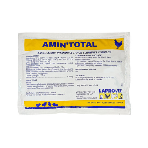 آمین توتال ترکیب کاملی از ویتامین ها، اسیدهای آمینه و عناصر معدنی بوده که در زمان استرس، واکسیناسیون، تغییرات آب و هوایی یا غذایی و یا حمل و نقل، تولید بالا و آنتی بیوتیک تراپی جهت بهبود بازده گله استفاده میگردد. این محصول در بسته بندی 150 گرمی عرضه شده است و مقدار مصرف آن یک بسته ی.150 گرمی برای 1500 لیتر آب آشامیدنی پرندگان می باشد.